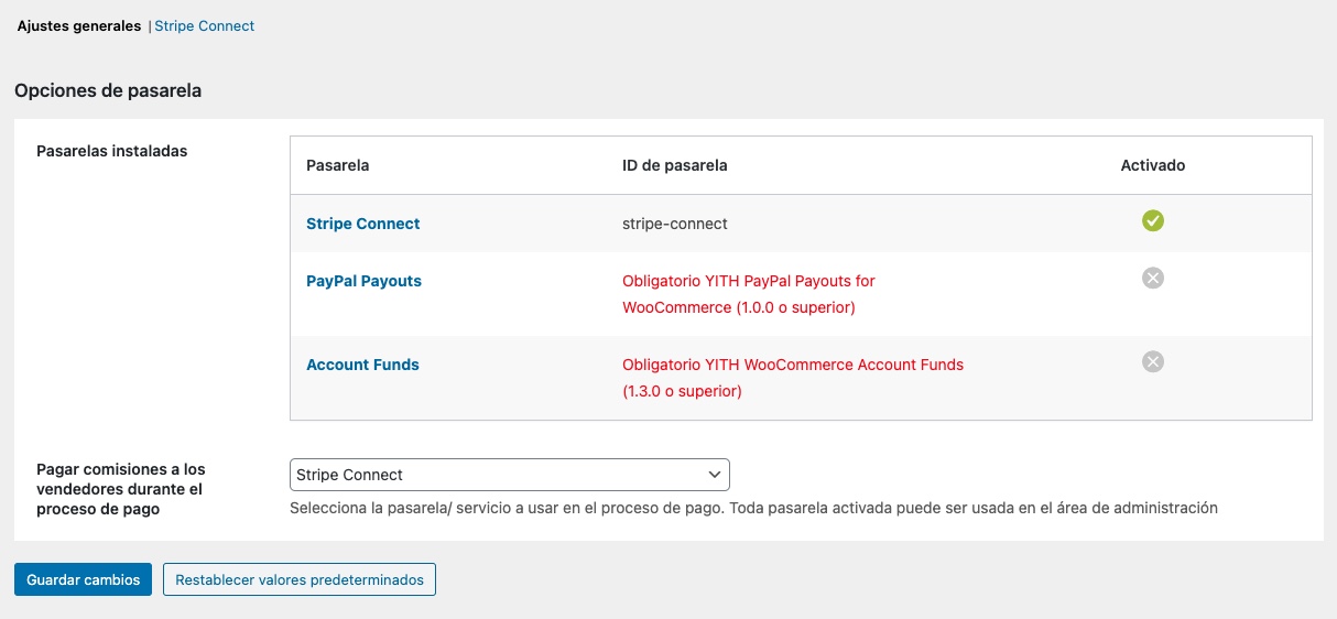 Esto es fácil de configurar con plugins como WooCommerce MultiVendor / MarketPlace, donde inicialmente debes conectar como administrador la pasarela Stripe Connect y seleccionarla como pasarela para los pagos a vendedores en los ajustes del plugin.