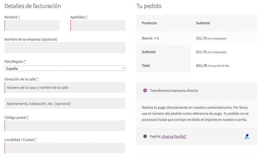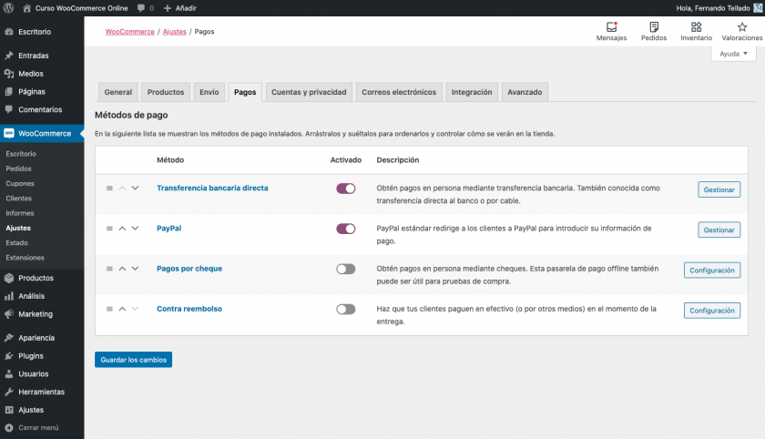 Por defecto, WooCommerce ofrece varias formas de pago: