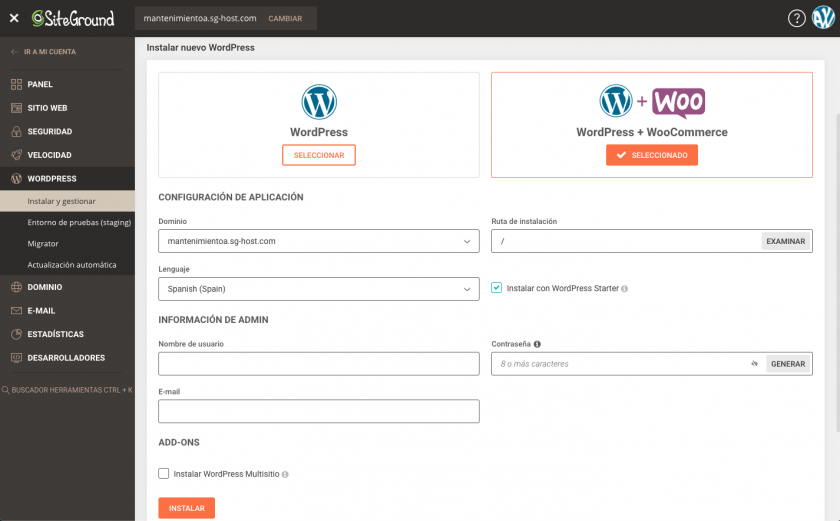 Instalar WordPress + WooCommerce es más que sencillo, pues nada más contratar tu alojamiento (en SiteGround al menos) encontrarás un instalador que lo hace por ti en un par de clics.