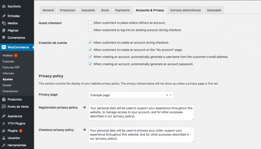 - Posibilidad de añadir el texto de privacidad a las páginas de Mi cuenta y Finalizar compra