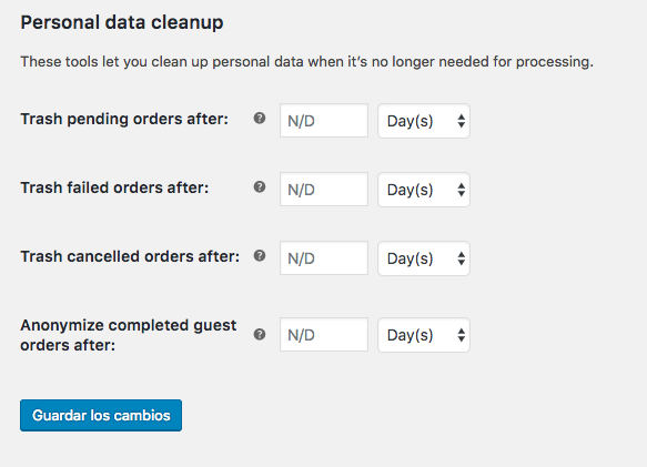 Para terminar, también podemos especificar cada cuanto tiempo queremos enviar a la papelera o hacer anónimos datos de los clientes.