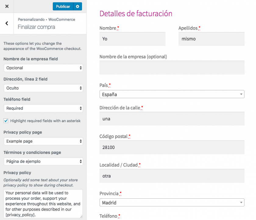 Y en cuanto a la posibilidad de personalizar qué campos se verán o no al finalizar compra, esta funcionalidad la verás en el Personalizador. al igual que con la personalización de los textos de privacidad.