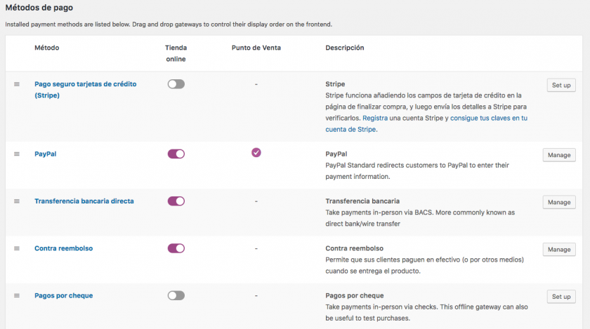 Ahora están todas las opciones integradas cada una en la pestaña de cada pasarela, y una página principal donde cambiar su orden en el pago, y acceder a los ajustes de cada una.
