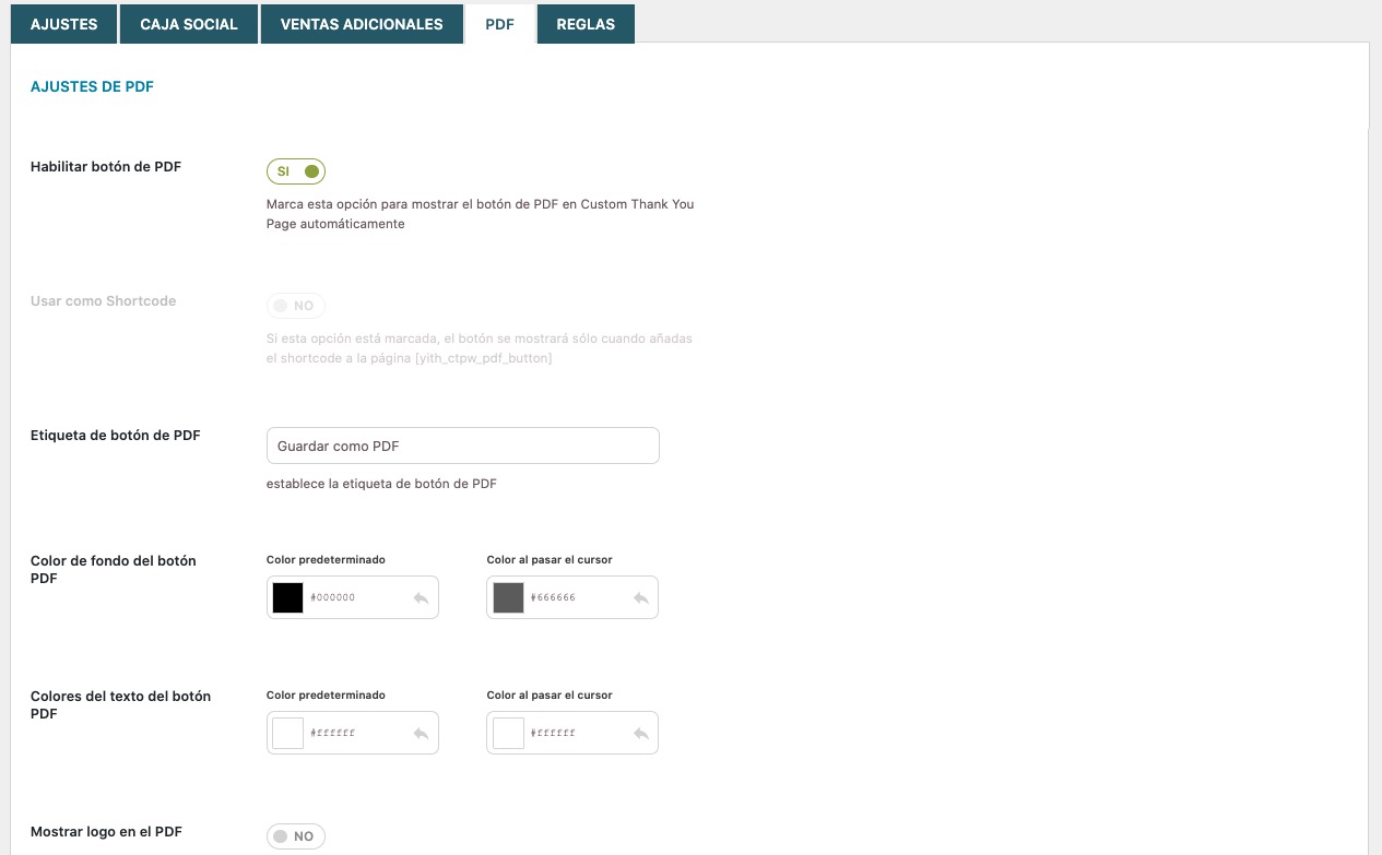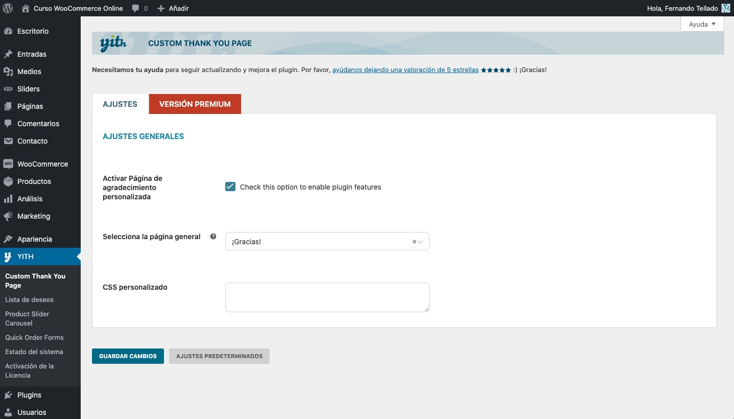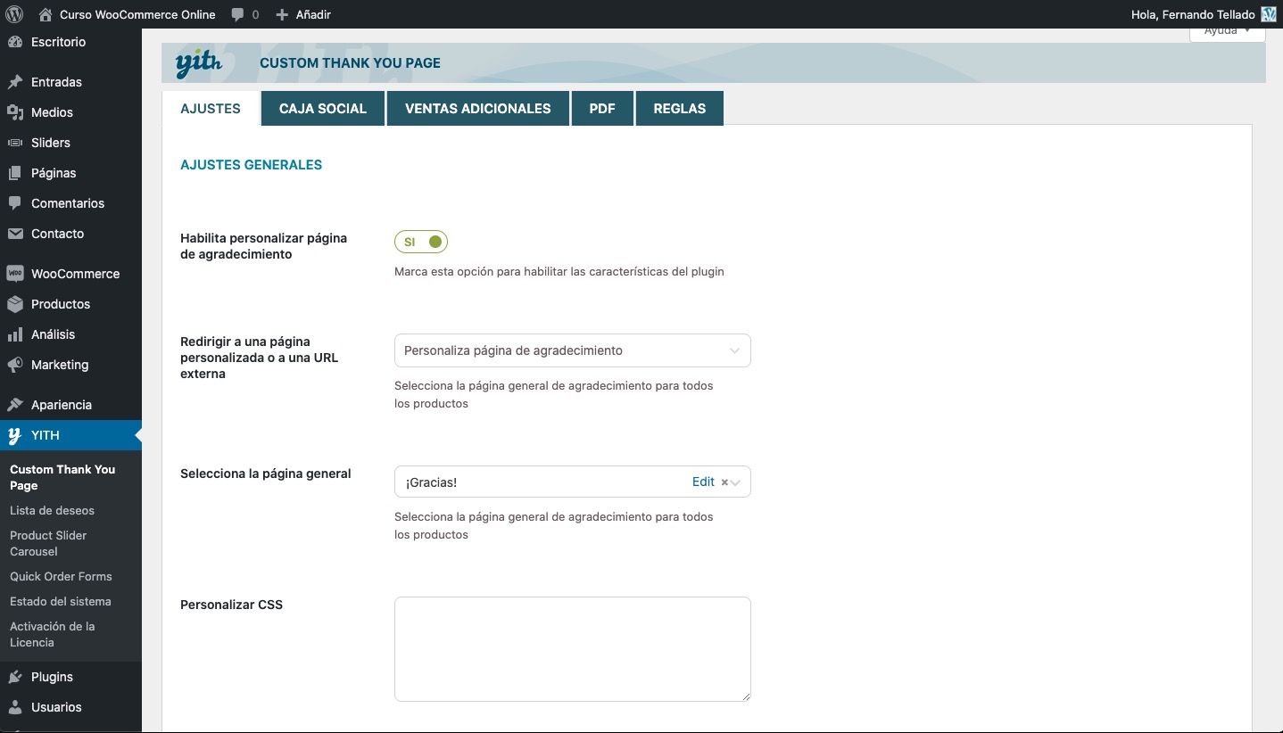 Publica la página y, ahora sí, en la página de ajustes de la administración de tu WordPress en YITH -> Custom Thank You Page, seleccionas la página de agradecimiento que acabas de crear, y añades si lo deseas algo de CSS.