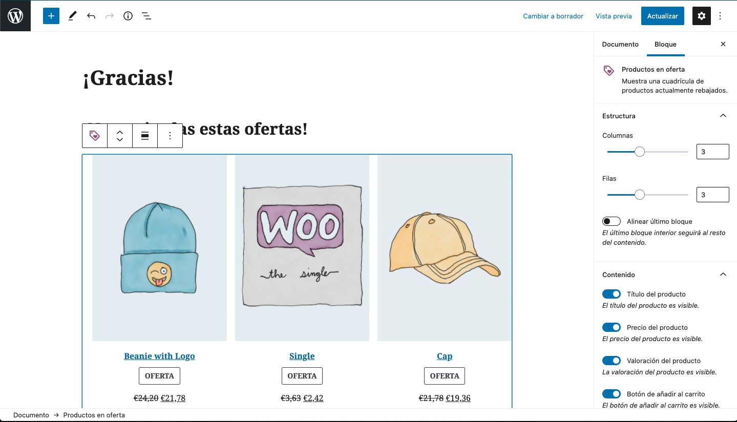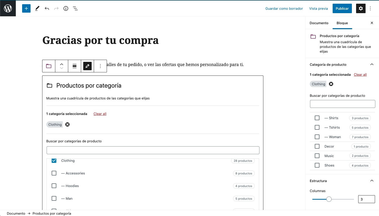 El primer paso es que crees una página de agradecimiento personalizada, como crearías cualquier página (Páginas -> Añadir nueva) y la pones a tu gusto, insertando bloques de productos, texto, lo que quieras.