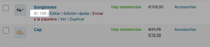 Para saber el ID de los productos solo tienes que pasarte por la pantalla de administración de productos y, al pasar el cursor sobre cualquier producto, se mostrará su ID.
