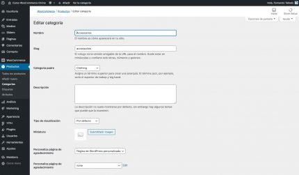 Es más, si lo prefieres, puedes elegir la página personalizada en la pantalla de gestión de categorías, tanto al crear nuevas como en las ya creadas.