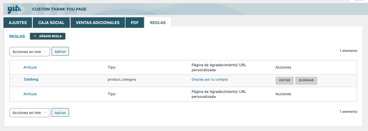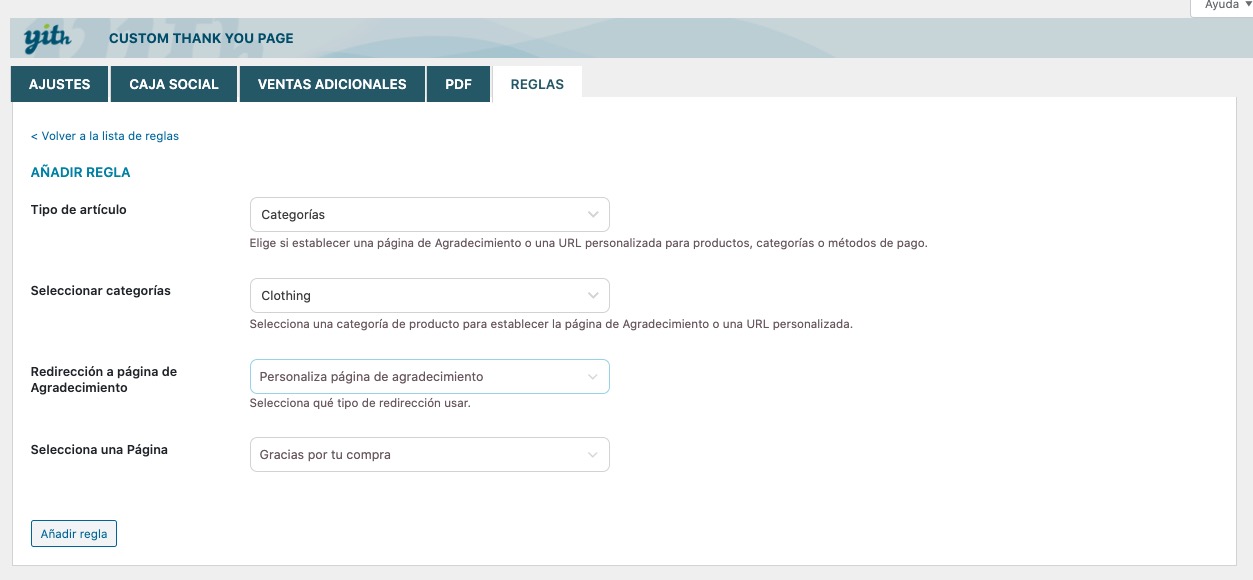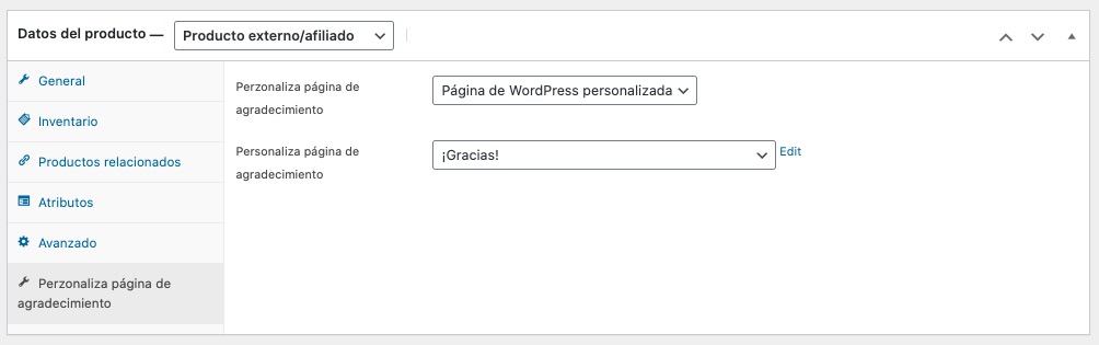 Aquí la cosa cambia enormemente, y ya puedes crear páginas de agradecimiento múltiples y variadas y asignar cada una a categorías, productos concretos, etc.
