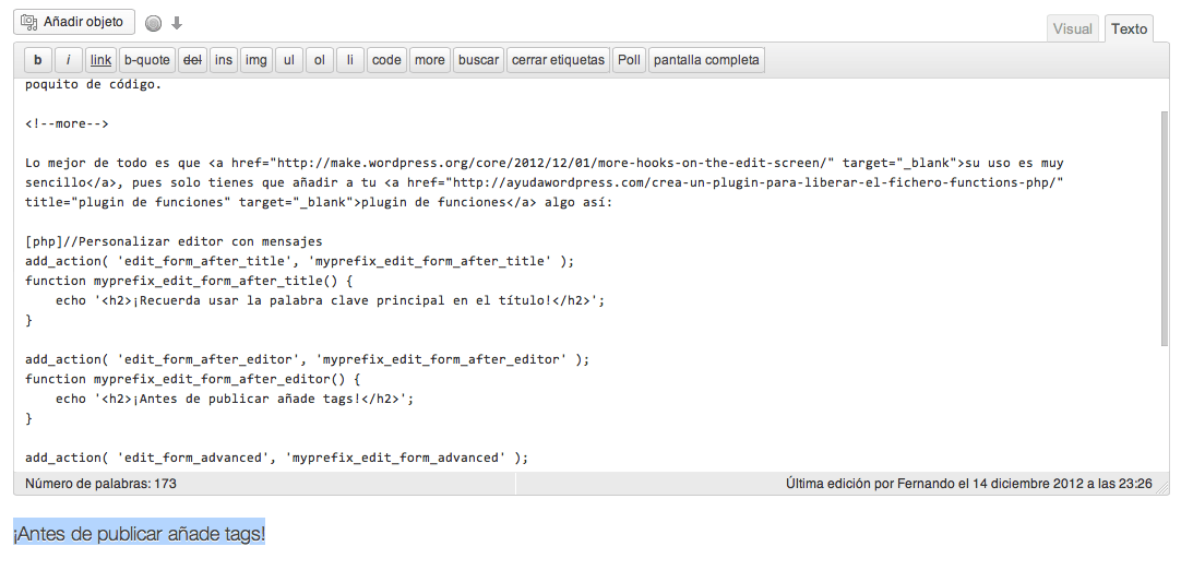 Una de las novedades introducidas a partir de la versión WordPress 3.5 que no son tan obvias como el resto son unos nuevos hooks de administración, en concreto edit_form_after_title y edit_form_after_editor, que además son muy útiles a nada que le pierdas el miedo a tocar un poquito de código.