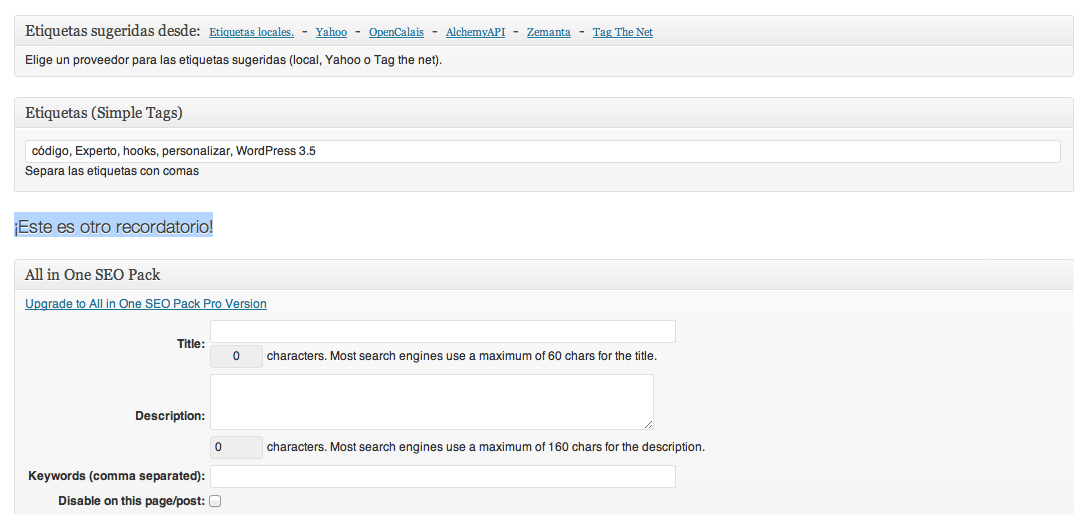 En el ejemplo verás que también se usa el ya existente previamente hook edit_form_advanced, que todavía puedes usar para insertarlo bajo las cajas estándar, o si lo prefieres, también sigue vigente para las páginas el hook edit_page_form.