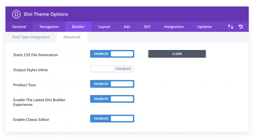 Si estás utilizando WordPress 5.0 o superior, aparecerá una nueva opción en Divi > Opciones del Tema > Builder > Avanzado.