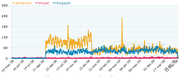 Ya puestos, también es interesante el impulso de WordPress a partir de Agosto de 2.008, según se puede comprobar en la herramienta Tendencias. ¡Impresionante!