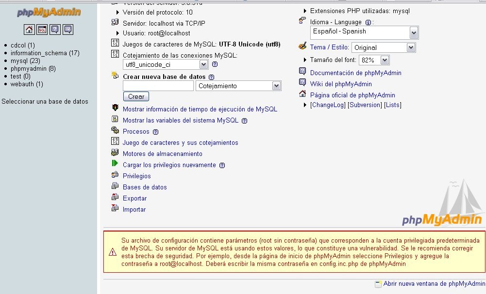 Perfecto, podemos ingresar, de paso, aprovechemos y creemos una base de datos.