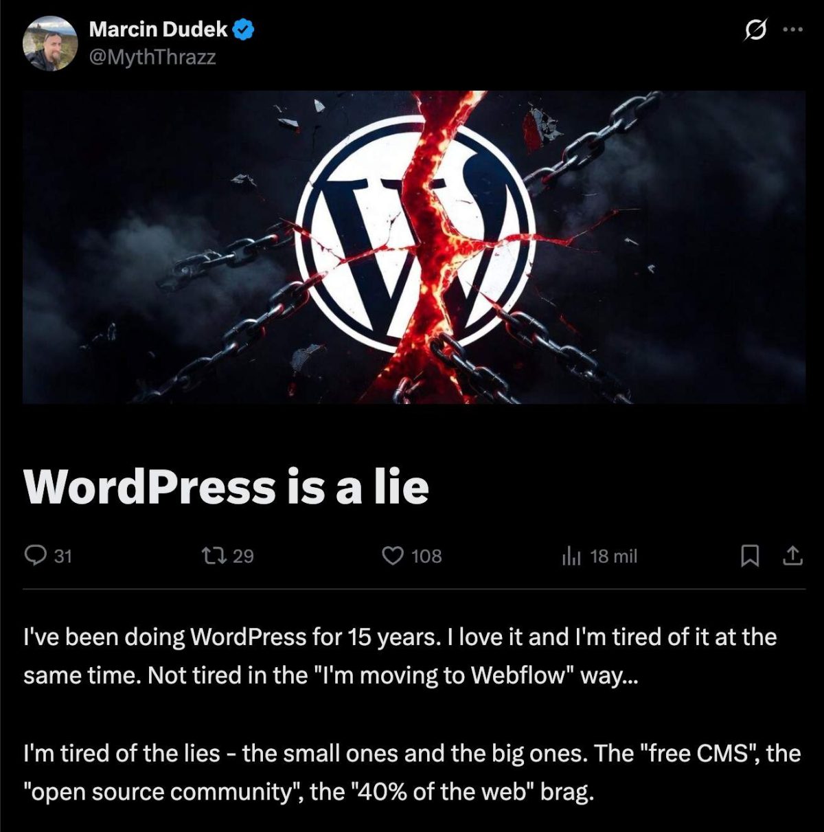 WordPress tiene problemas, varios, y algunos de los que señalas son reales, pero se arreglan como hizo Nick Hamze, con un .diff y cuatro tests unitarios, o compartiendo plugins gratis y tutoriales a diario desde hace 20 años, como este humilde bloguero español, no con un manifiesto en Twitter.