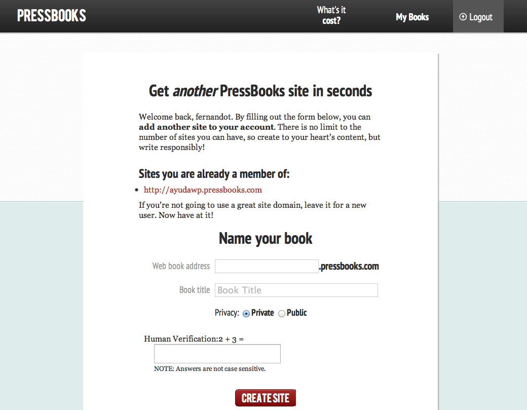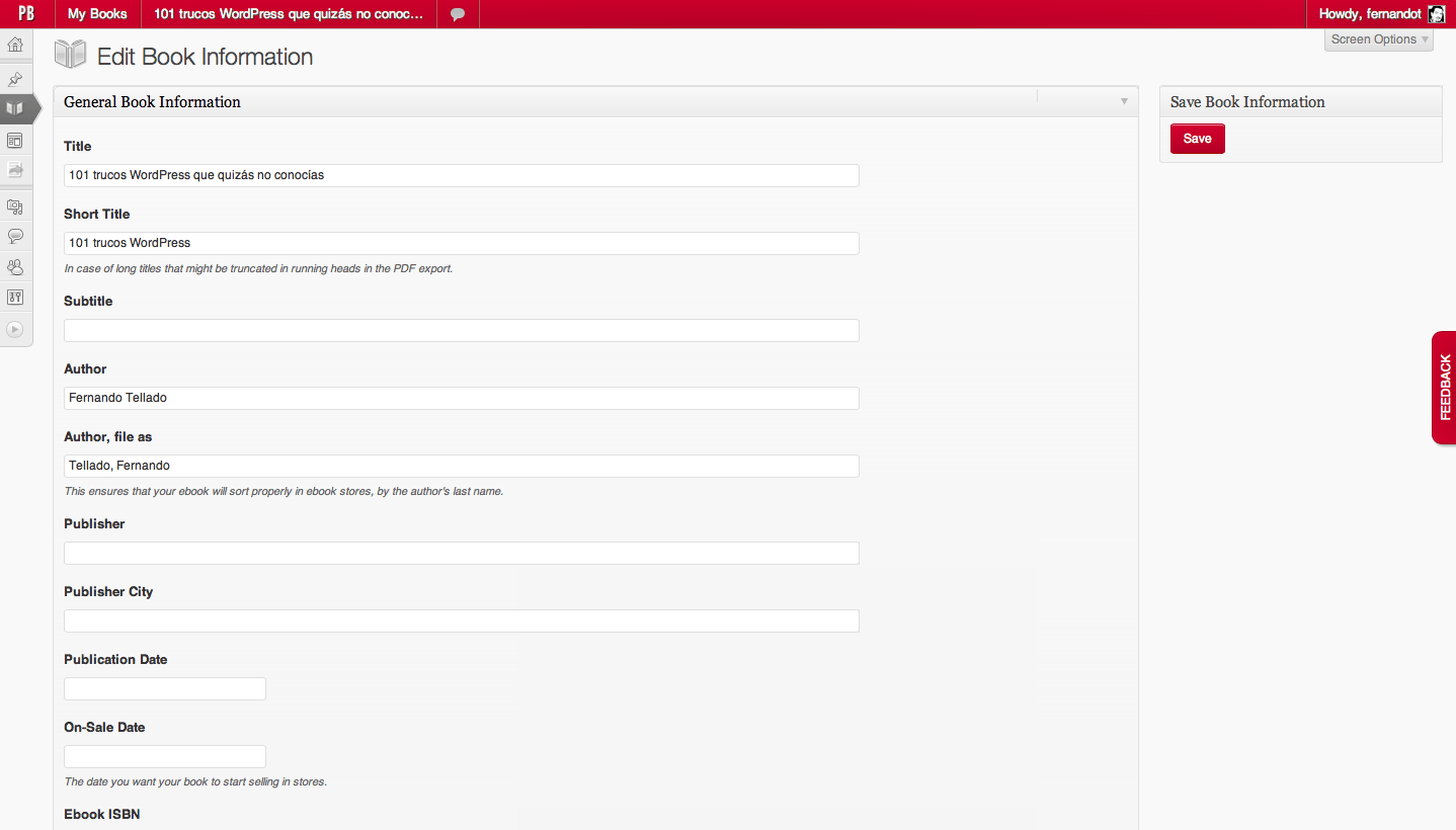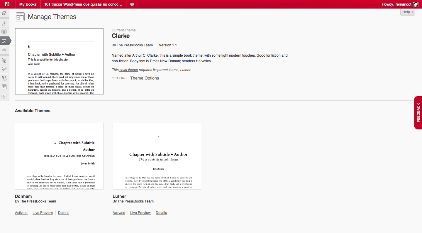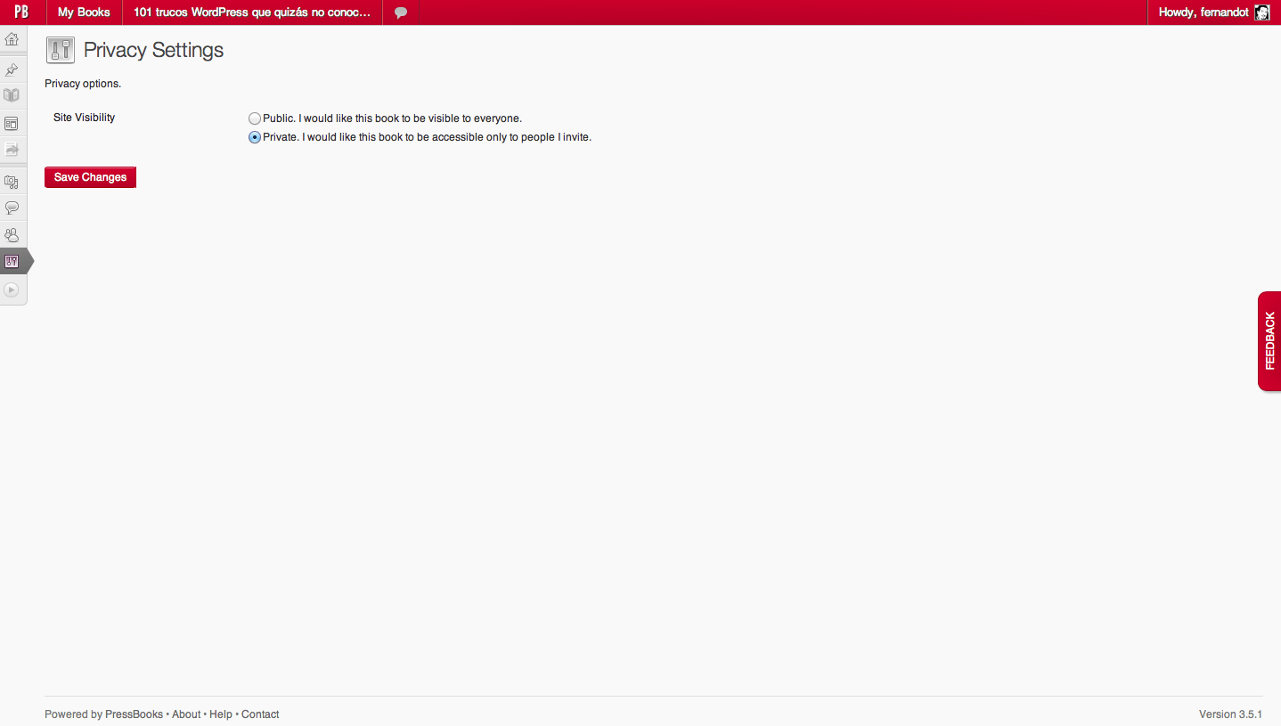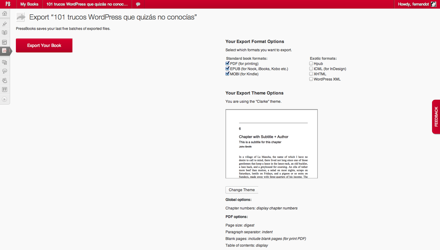 Te he dicho que el registro es gratuito, y puedes añadir tantos libros cómo quieras, que se mostrarán cada uno cómo si de un WordPress Multisitio se tratase, donde cada libro es un sitio (bueno, en realidad es exactamente eso lo que hace), pues el modelo de negocio de PressBooks es que ellos se ocupen, si tu quieres, de la publicación de tus libros. ¿Quieres hacerlo tu mismo?, perfecto, lo exportas a los formatos disponibles y lo mueves a voluntad.