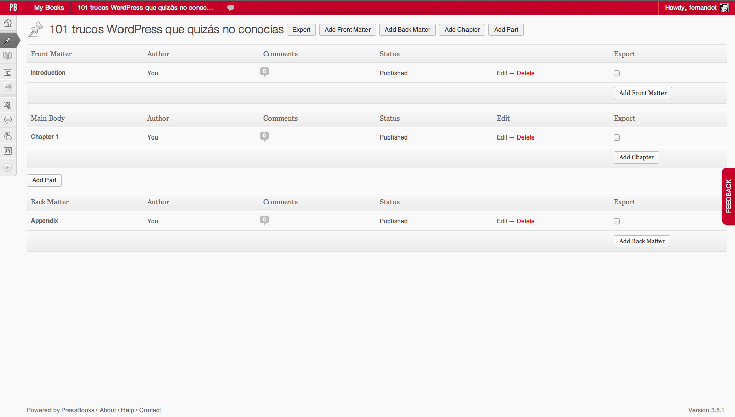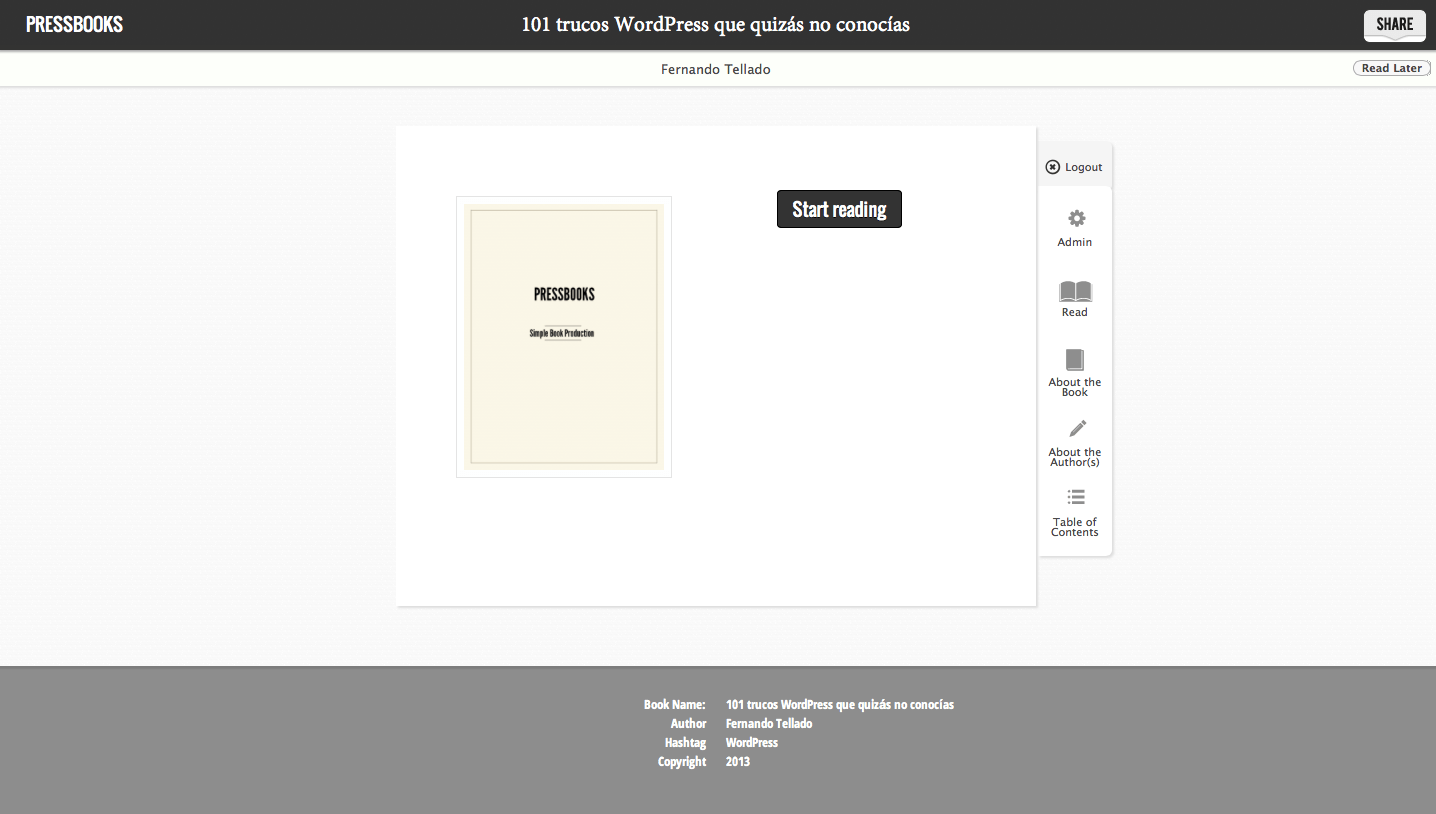 Lo bueno es que ahí tienes total libertad de, por ejemplo, importar entradas de otro WordPress, algo que a día de hoy no permite PressBooks.com. Por supuesto, es GPL y puedes adaptarlo a tus necesidades o incluso ofrecer tu mismo el servicio desde tu propio servidor.